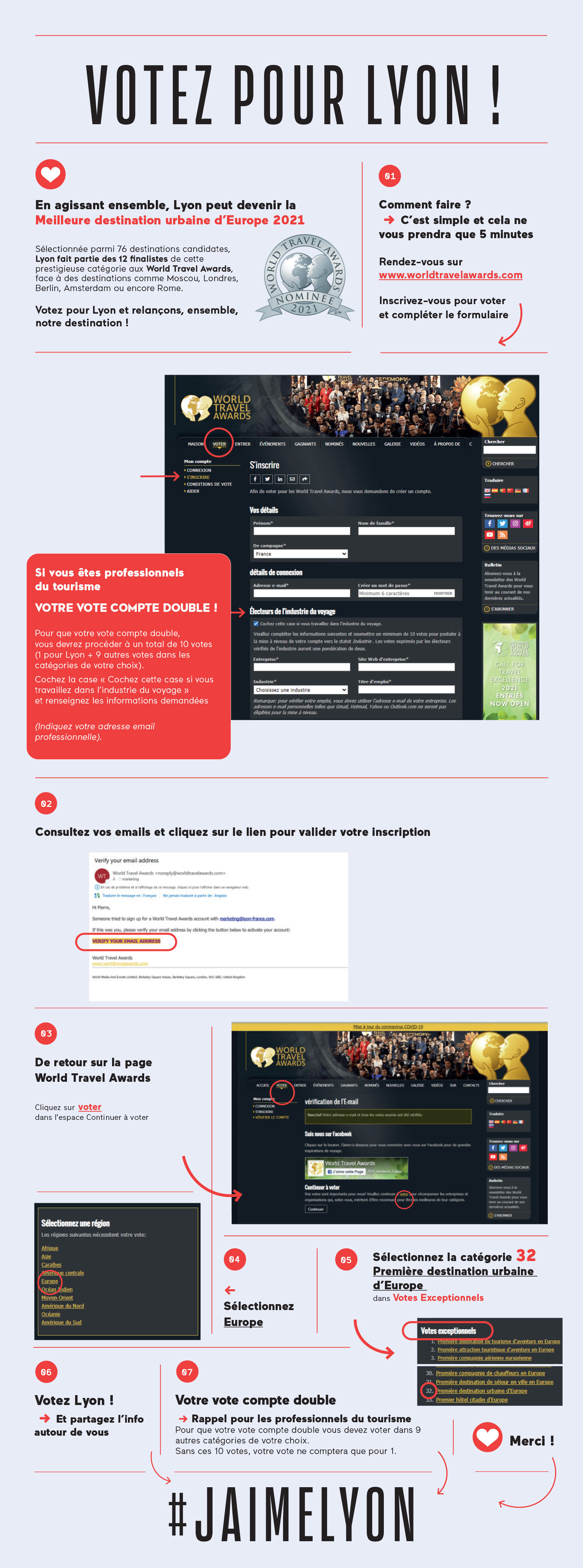 Considérés comme les Oscars du Tourisme par le Wall Street Journal, les World Travel Awards récompensent l’excellence en matière de tourisme et sont une véritable référence à travers le monde. Souvenez-vous, en 2016, Lyon avait remporté le titre de « Meilleure destination européenne de week-end » grâce à la mobilisation de tous. Cette année encore, nous avons besoin du plus grand nombre de votes pour devenir la Meilleure destination urbaine d’Europe !