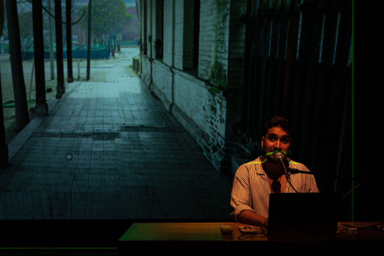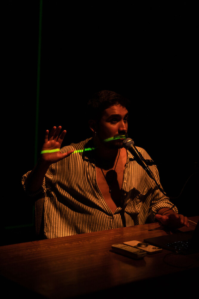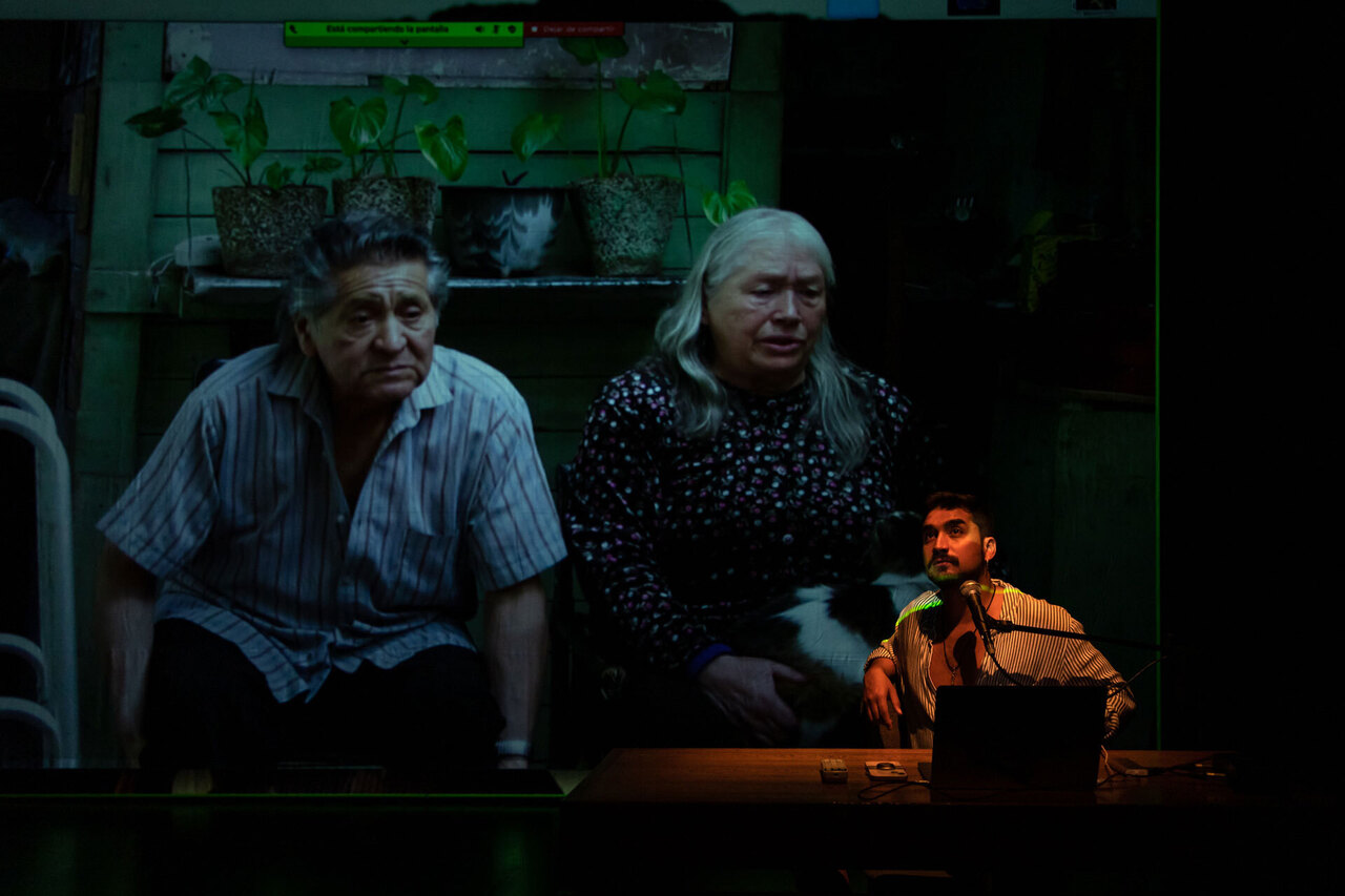 Assis derrière un ordinateur, face au public, il projette des images de ses grands-parents évoquant leurs luttes passées sous la dictature, ou celles d’autres Chiliens relatant leur situation actuelle, souvent précaire. Il relie entre eux les secrets enfouis de son pays. Par le biais de ces fragments de récits, le trentenaire trouve un écho jusqu’en Europe avec ce spectacle.